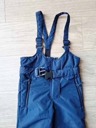 Conjunto de pantalón de esquí y guantes para niño/a. - Pantalón de esquí azul con tirantes. Largo de tirantes y cinturilla ajustable con velcro. Las perneras también pueden acortarse con unas cremalleras. Tiene faldón impermeable para que no entre nieve de las botas.Muy calentito y transpirable. - Incluye un par de guantes negros de esquí de la misma talla. Muy poco uso. Se le quedó pequeño.