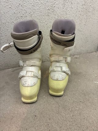 Botas de esquí de la marca Salomon. - Color blanco y amarillo. - Cierre con hebillas.