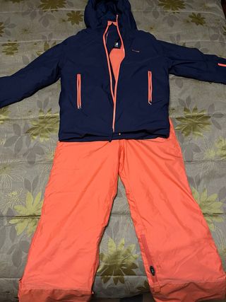 Conjunto de esquí para niño o niña de 12/14 años, compuesto por chaqueta y pantalón. Marca Decathlon. Buen estado. - Chaqueta azul marino con detalles en coral. - Pantalón de color coral. - Cremalleras en los bolsillos de la chaqueta y en los bajos del pantalón.