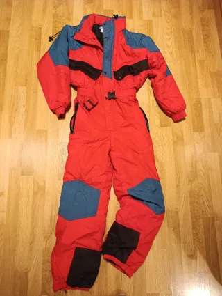 Mono de esquí con un diseño llamativo en rojo, azul y negro. Perfecto para disfrutar de la nieve con estilo. Talla 16. Decathlon. - Cremallera frontal. - Cinturón ajustable. - Puños elásticos. - Bolsillos.