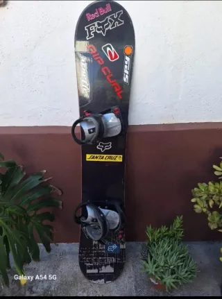 Tabla de snowboard talla 155 cm, ideal para disfrutar de la montaña. - Diseño con múltiples pegatinas de marcas reconocidas. - Fijaciones incluidas.
