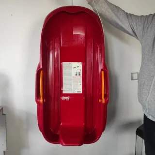 Trineo de plástico rojo para deslizarse por la nieve. Tiene asas naranjas a los lados para un mejor agarre. - Color: Rojo - Material: Plástico - Asas: Naranjas