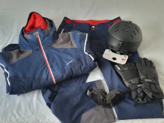 Conjunto completo de ropa para la nieve, ideal para disfrutar de actividades al aire libre. - Chaqueta azul con detalles grises y forro rojo. - Pantalón de nieve azul con cintura roja. - Casco negro para esquí. - Guantes negros de invierno. - Gafas de esquí.