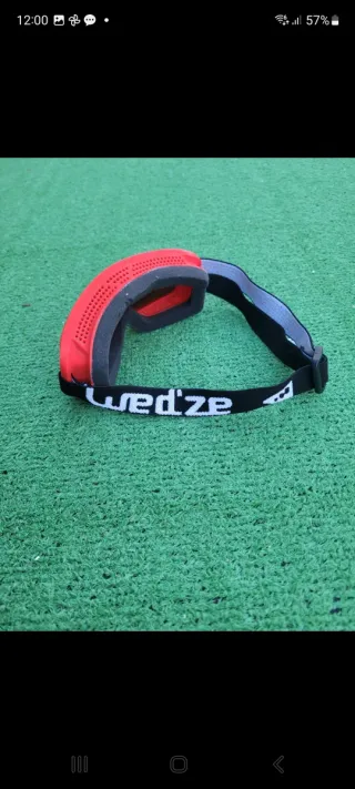Gafas de esquí con montura negra y correa ajustable. Usadas cinco días para una excursión. - Lente con acabado espejo. - Diseño envolvente para mayor protección.