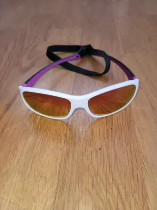 Gafas de nieve para niños de entre 6 y 8 años. Perfectas para proteger sus ojos en la montaña. - Montura blanca y detalles en color fucsia. - Lentes naranjas con efecto espejo. - Correa ajustable negra.