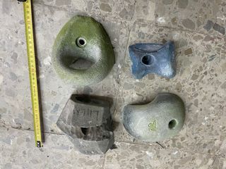 Set de cuatro presas de escalada de diferentes formas y colores. - Presa azul con forma de B. - Presa verde con forma de riñón. - Presa verde con forma de aro. - Presa gris con forma de bloque.