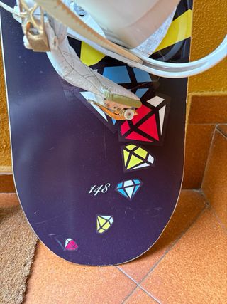 Tabla de snowboard Crazy Creek para chica. Presenta un diseño divertido con diamantes y un acabado en rosa y azul. - Diseño con estampado de diamantes. - Detalle de texto Eccentric en azul. - Base en color rosa vibrante. Perfecto estado , con fijaciones incluidas. Media 1,48