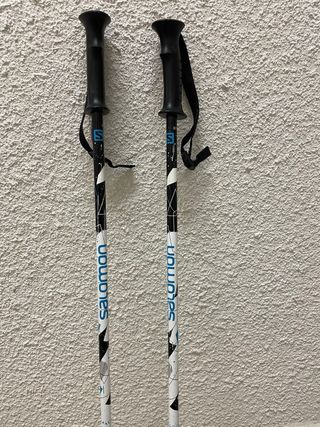Bastones de esquí de la marca Salomon, diseñados para niños. - Longitud de 85 cm. - Diseño blanco con detalles en negro y azul. - Empuñaduras negras con correas. - Discos negros en la parte inferior.