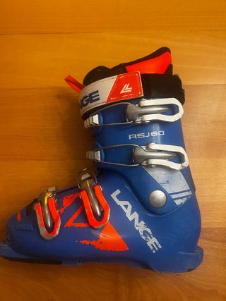 Botas de esquí infantiles de la marca Lange. - Modelo RSJ 60. - Color azul con detalles naranjas. - Cierres de hebilla metálica. Talla 21MP (34 aprox.) Entrega en Bilbao o Candanchú.