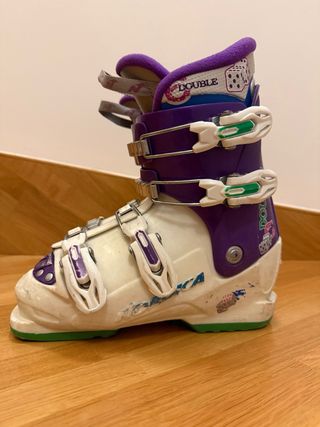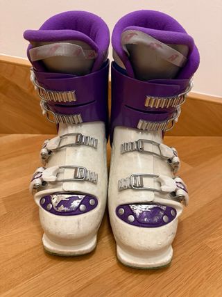 Botas de esquí de la marca NORDICA. - Talla 23/23.5. Equivale a un 35/36 - Diseño con detalles en morado y blanco. - Cierres de hebilla. - Suela verde.