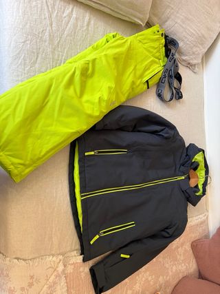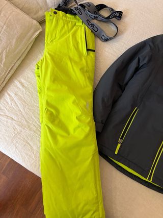 Conjunto de esquí para niño de la marca CMP. - Chaqueta negra con detalles en amarillo neón. - Pantalón amarillo neón. - Tirantes grises con logo CMP.