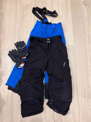 Conjunto de 2 pantalones de esquí para niños o niñas, perfectos para disfrutar de la nieve con comodidad y protección. Regalo un par de guantes. - Pantalones de esquí azules con tirantes ajustables. Talla 4-5 años - Pantalones de esquí negros con cremalleras. Extensibles y calentitos. Estan en muy buen estado. Talla 4 años, pero yo he utilizado con 5 tambien. - Guantes negros con detalles blancos y rojos. Estan bastante desgastados por eso regalo.