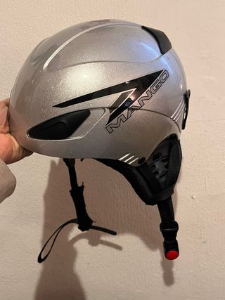 Casco de esquí plateado con detalles en negro y logo de la marca Mango. - Talla 59cm. - Diseño deportivo.