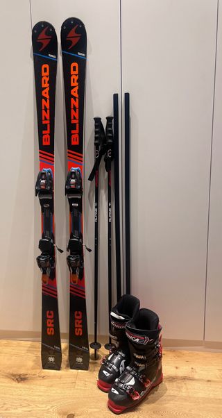 Conjunto completo de esquí para disfrutar de la montaña. Incluye esquís Blizzard SRC, fijaciones y bastones. - Esquís Blizzard SRC con diseño deportivo. - Fijaciones de esquí robustas. - Bastones de esquí negros.