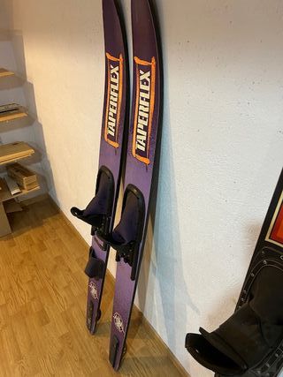 Par de esquís acuáticos Taperflex. - Color morado con detalles en naranja. - Fijaciones ajustables.