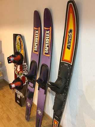 Lote de tabla de wakeboard y dos esquís acuáticos y mono esqui. - Tabla de wakeboard con diseño gráfico. (neuvo) - Dos esquís acuáticos marca Taperflex. - Un esquí acuático marca Connelly.