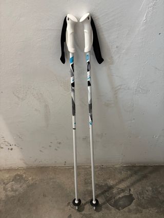 Par de bastones de esquí para niños. Tienen un diseño moderno y son ligeros. - Mangos ergonómicos blancos con correas negras. - Ejes blancos con diseño gráfico en blanco, negro y azul. - Puntas negras.