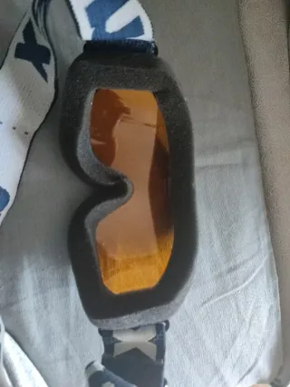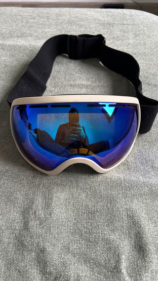 Máscara de esquí con lente azul reflectante y montura blanca. - Correa negra ajustable. - Diseño envolvente para mayor protección.