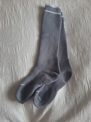 Calcetines de esquí de color gris, diseñados para ofrecer comodidad y soporte. - Talla: 35-38 - Color: Gris - Diseño alto para cubrir la pierna - Ribetes blancos en la parte superior