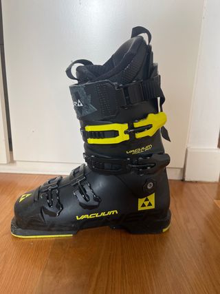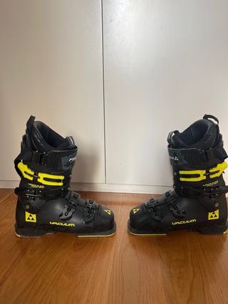 Botas de esquí Fischer en talla 26.5, equivalente a una talla 41 de calzado. - Color negro con detalles en amarillo. - Cierres de hebilla. - Tecnología VACUUM FULL FIT. - Thermo Shape La cinta de atrás de la bota derecha está despegada por un lado. Ver foto.