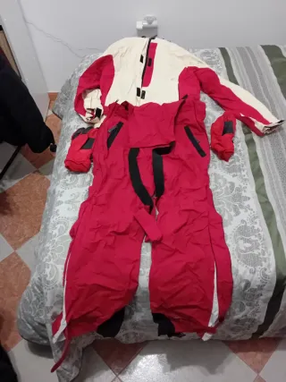 Conjunto de esquí de dos piezas en colores rojo, blanco y negro. Ideal para disfrutar de la nieve. - Chaqueta con cremallera frontal y detalles en negro. - Pantalones de esquí con bolsillos y tiras negras. - Mangas y detalles laterales en blanco.