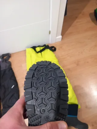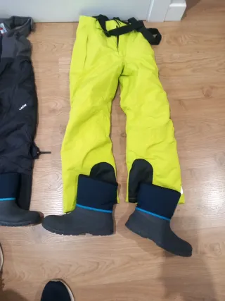 Conjunto de ropa de invierno para niños, ideal para la nieve. - Pantalón de color verde lima con tirantes. - Botas de nieve negras con detalles azules. Botas 36/ 37 o 32/33 . Tengo dos trajes uno para niño/a de 4 a 5 años y otro apartir de 5 años . 25 Euros cada traje + Botas de nieve.