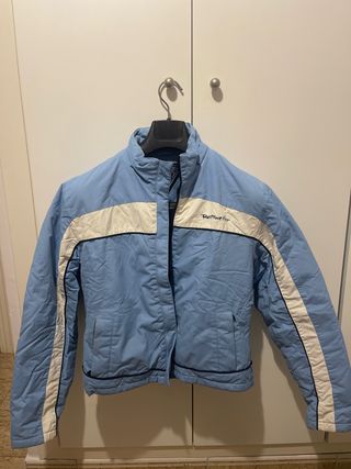 Chaqueta de esquí con un diseño moderno y deportivo. - Color azul claro con detalles en blanco. - Cuello alto. - Cierre de cremallera frontal.