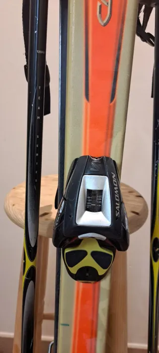 Se venden esquís Salomon en buen estado. - Fijaciones Salomon incluidas. - Diseño con detalles en naranja y beige. - Bastones de esquí negros con detalles amarillos.