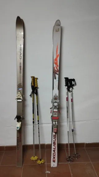 Se venden dos pares de esquís de 180 cm junto con dos pares de bastones. - Un par de esquís marca HEAD SP. - Un par de esquís marca EXCALIBUR Tua. Fijaciones antiguas - Dos pares de bastones de esquí.