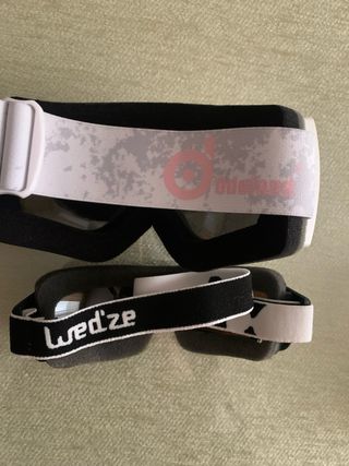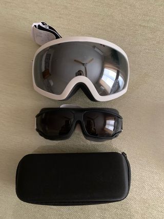 Pack de gafas de esquí con funda protectora. Son de adulto - Gafas de esquí blancas con lente espejada. Marca Odoland - Gafas de sol negras mas pequeñas. Marca Wezde - Funda rígida negra para las gafas pequeñas