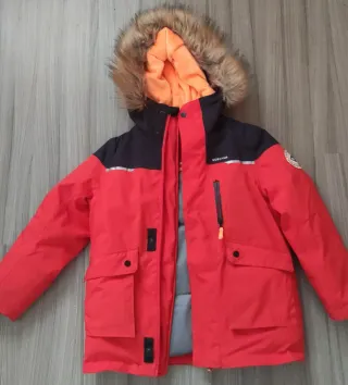 Chaqueta de esquí para niño, talla 7-8 años (123-130cm). Diseñada para mantener el calor y la sequedad en la montaña. - Color rojo vibrante con detalles en negro y reflectantes. - Capucha con pelo sintético. - Cierre frontal con cremallera y botones. - Bolsillos frontales con solapa y bolsillo en el pecho con cremallera. - Puños ajustables.
