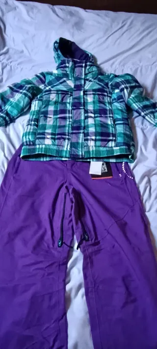 Conjunto de ropa de nieve para actividades al aire libre. Tallas, pantalón 38 Chaqueta 176 - Chaqueta a cuadros en tonos verdes y morados. - Pantalones de color morado intenso con reflector de avalanchas También se vende por separado,50€ cada uno