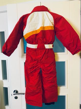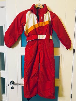Conjunto de esquí infantil de color rojo, ideal para mantener a los más pequeños abrigados y protegidos en la montaña. Diseñado para la comodidad y el movimiento. - Diseño con detalles en blanco y naranja. - Cinturón blanco a juego. - Cuello alto para mayor protección.