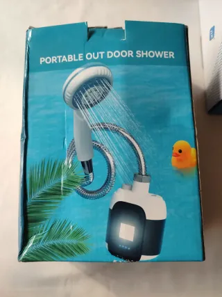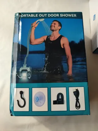 Ducha portátil para usar en exteriores, ideal para camping o actividades al aire libre. Diseñada para ser práctica y fácil de transportar. - Manguera flexible. - Cabezal de ducha. - Unidad de bomba. - Diseño compacto.
