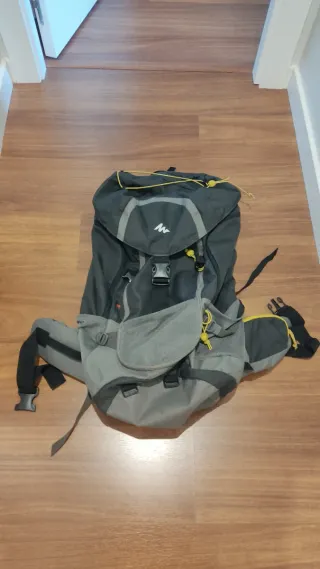 Mochila de la marca Quechua, ideal para acampada. - Color negro y gris. - Tirantes ajustables. - Múltiples compartimentos.