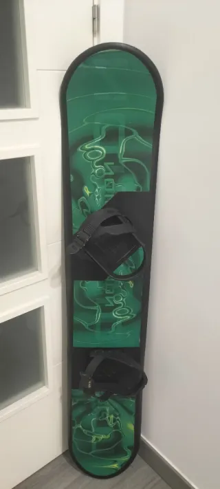 Tabla de snowboard con un diseño llamativo en color verde y negro. Ideal para disfrutar de la nieve. - Diseño con motivos verdes y amarillos. - Fijaciones negras incluidas.