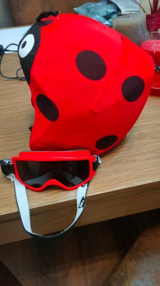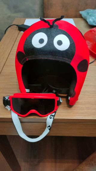 Se vende casco de esquí marca Briko que va con funda de mariquita. Están incluida la máscara de esquiar. Falta la trabilla de las gafas pero no es importante.Talla del casco 54 cm.