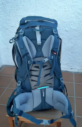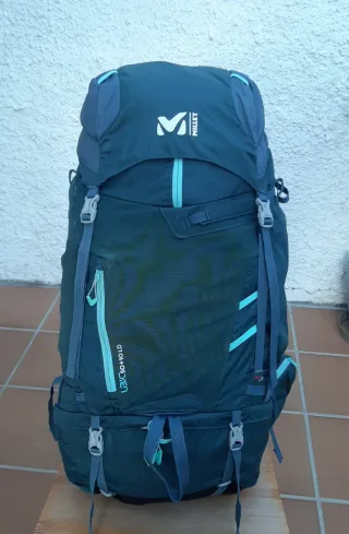Mochila Millet Ubic de 50 litros ampliable 10 más hasta 60. Modelo diseñado para mujeres (u hombres hasta 1'70 m de estatura) por su espalda más pequeña. Espalda súper ventilada y regulable en altura. Apertura por arriba y por abajo, separable con cremallera. VariLoop System para llevar esquís en diagonal. Cintas de compresión. Bolsillo frontal elástico. Bolsillo lateral expandible. Bolsillo en cinturón lumbar Porta bastones y piolets. Compatible con sistema H2O. En buen estado, la parte del cierre de arriba está desgastada pero queda cubierta por la seta. El cinturón lumbar algún agujero. Salewa,Mammut, Lowe Alpine,Ferrino.