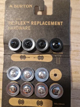 Kit de repuesto de tornillos para fijaciones Burton Re:Flex. - Incluye 4 tornillos negros M6x13mm. - Incluye 7 tornillos plateados M6x16mm. - Incluye 1 arandela plateada.