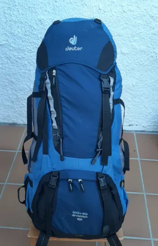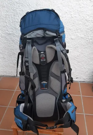 Mochila Deuter AirContact de 60 litros expandible hasta 70. En perfecto estado. Tejido: Cordura y Ripstop. Concebida para trekking largos y grandes viajes. Espalda súper ventilada AirContact y sistema Variflex regular la altura. Super estable, 3 cintas de compresión a cada lado!! Compatible con sistema H2O. 2 bolsillos laterales expandibles de 45 cms, debajo 2 elásticos para bebidas + 2 en la seta + 1 frontal+ 1 en cinturón lumbar. Compartimento para funda de lluvia con cremallera (funda perdida, no incluida). Panel SOS. Salewa, Millet, Vaude, Mammut, Ferrino, Lowe Alpine, Black Diamond, Vango, Trango North Face...