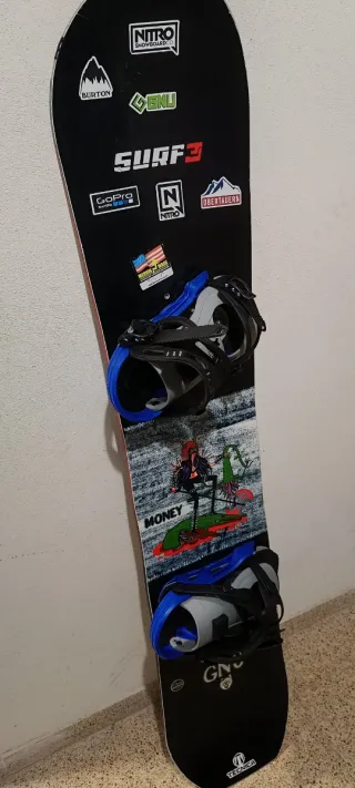 Tabla de snowboard marca GNU (150) con marcas de uso pero en perfecto funcionamiento tiene unos 20 días de uso, es una tabla perfecta para jugar super manejera y permisiva, su canto es magne tration( en forma de sierra) para más agarre en hielo, es twin directional para poder ir de switch. Las fijaciones son unas bent metal compradas a la vez que la tabla, son talla M