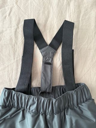 Pantalones de esquí para niña en talla 110/116. Son de color azul claro y cuentan con tirantes negros. - Tirantes ajustables. - Detalle de estrellas grises en el bajo. - Puños interiores en los tobillos.
