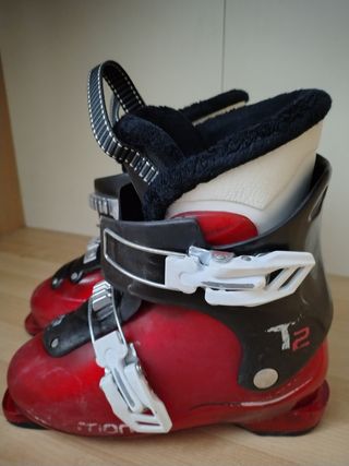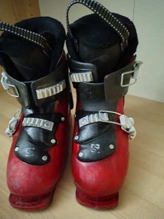 Botas de esquí Salomon en talla 24/24.5, con una longitud de suela de 285 mm. - Color negro con detalles blancos y rojos. - Cierres de hebilla ajustables. Están en buen estado, son. calientes y cómodas. Se vende porque se han quedado pequeñas.
