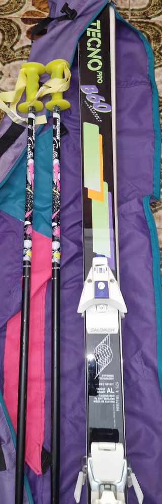 Esquís Tecno Pro B60 en buen estado. Ideales para principiantes o nivel intermedio. - Incluye 2 pares de bastones. - Fijaciones Salomon incluidas. - Diseño retro, colores llamativos.