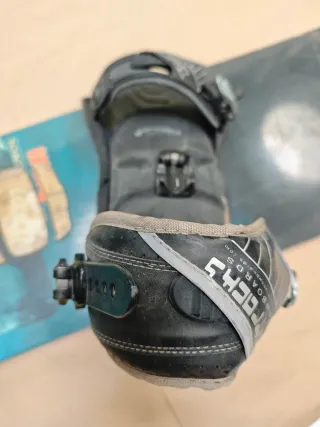 Tabla de snowboard con fijaciones incluidas. Diseño moderno y llamativo. Lo ha dado todo de ahí el precio.