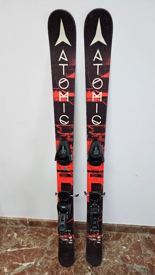 Par de esquís de la marca Atomic. - Color azul claro. - Diseño clásico. - Muy ligeros, perfectos para esquí. - Suelas y cantos bien conservados. - Foto de fijaciones en buen estado.