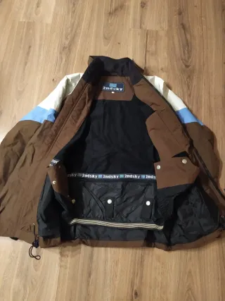 Chaqueta de la marca 2ndsky en talla M. Diseño moderno y funcional. - Color marrón con detalles en blanco y azul. - Cierre de cremallera frontal. - Bolsillos laterales con cremallera. - Cordón ajustable en el bajo.