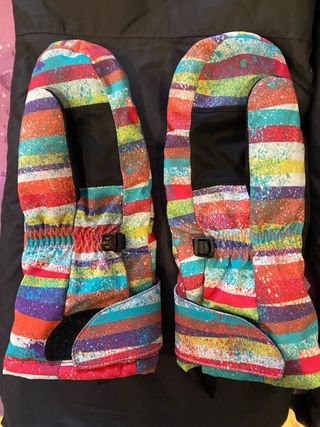 para Junior de 8 a 12 años, muy calentitas y usadas en solo una ocasión. Manoplas de esquí o snowboard de la marca Spyder con un diseño vibrante y colorido. - Diseño a rayas multicolores. - Estampado salpicado. - Logo de Spyder visible.