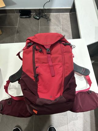 Mochila de 20 litros, ideal para actividades de montaña y senderismo. Esta nueva, no tiene etiqueta pero nunca ha sido usada. - Capacidad de 20 litros. - Diseño en color rojo y granate. - Compartimento principal con cierre de cordón y solapa. - Bolsillos laterales. - Cinturón lumbar acolchado. - Correas de hombro ajustables y acolchadas. -Espalda rigida y con tecnologia con malla para mejorar transpirabilidad. -Bolsillos de acceso rapido en el cinturon. -Bolsillo acceso rapido para cantimplora. -Funda protectora impermeable integrada. La vendo porque no la uso y me ocupa espacio. Precio en tienda 49,99€.