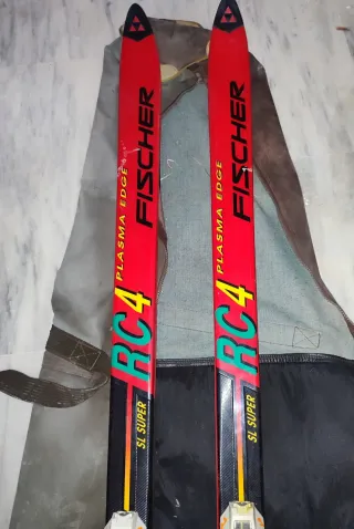 Esquís de la marca Fischer, modelo RC4 Plasma Edge. - Color rojo con detalles en verde y amarillo. - Inscripción FISCHER en grande. - Modelo SL SUPER en la parte inferior.